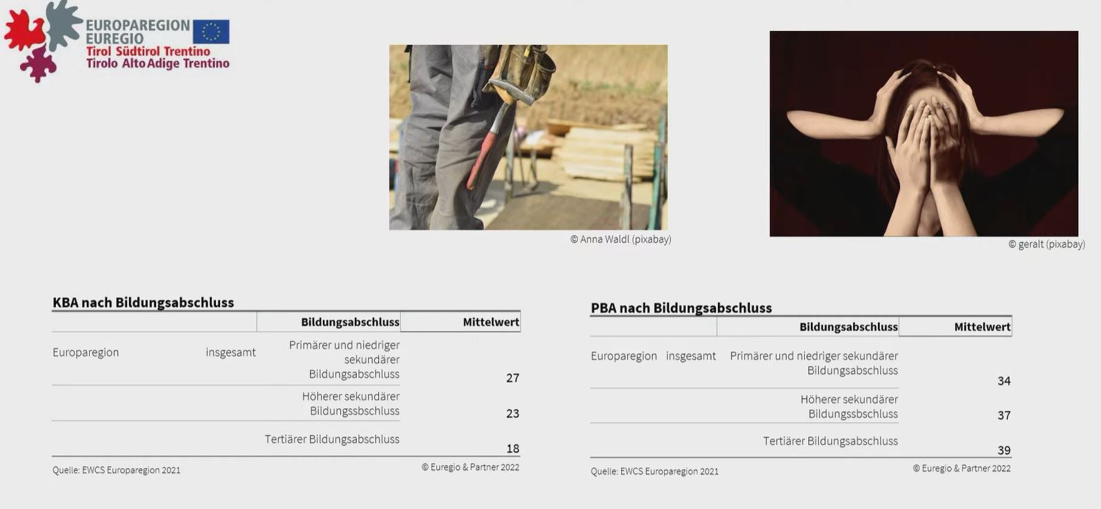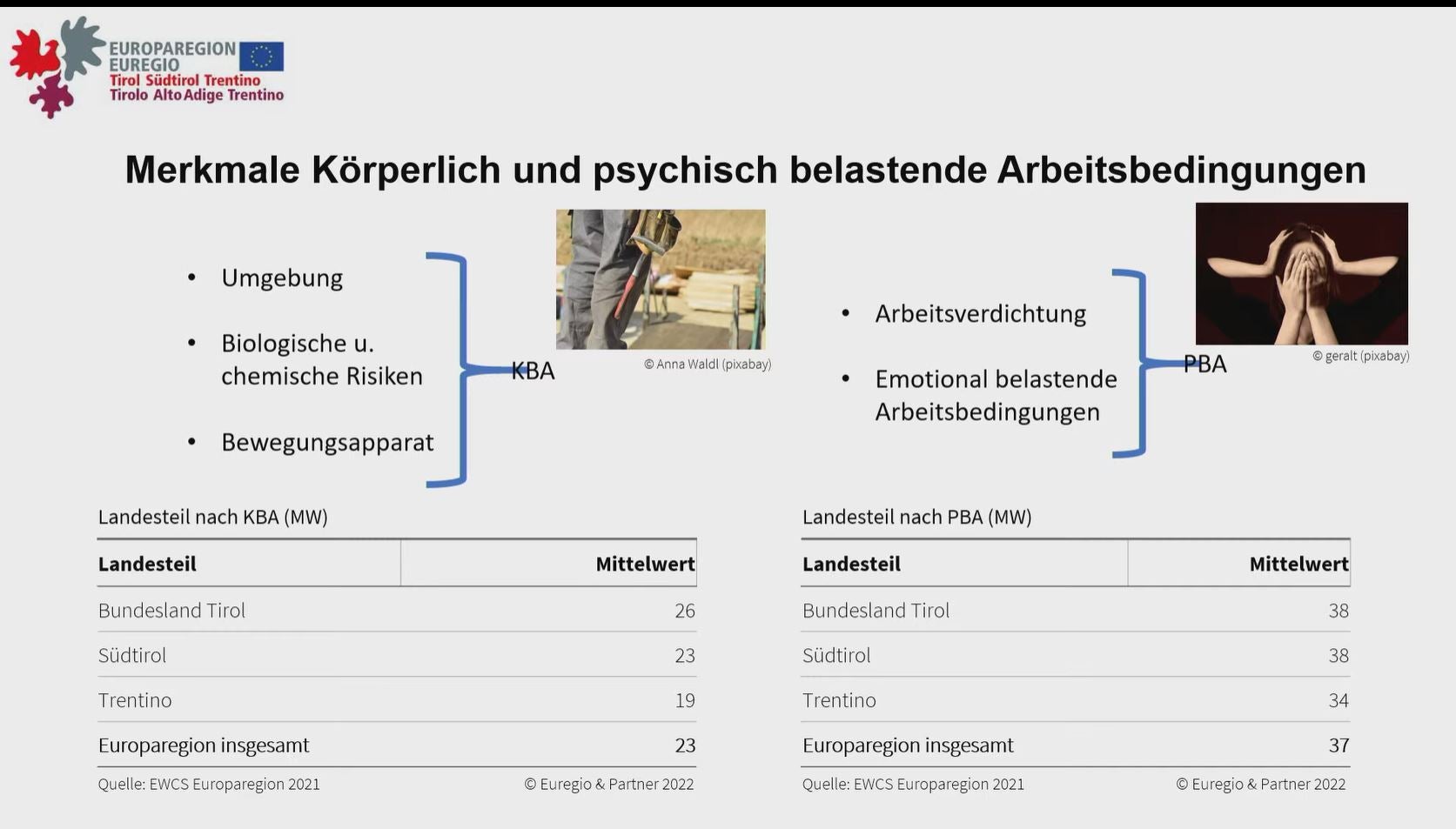 Psychisch belastende Arbeitsbedingungen wie Arbeitsverdichtung (hohe Arbeitsgeschwindigkeit, Zeitdruck usw.) und emotionsbedingte Arbeitsbelastungen (schwierige emotionale Situationen erleben, sich auch in der Freizeit um die Arbeit Sorgen machen müssen usw.) sind demgegenüber in der gesamten Europaregion grundsätzlich deutlich stärker ausgeprägt als die körperlich belastenden Arbeitsbedingungen. Hölbling hierzu: "Gerade Südtirol sticht in fast allen Branchen bei psychisch belastenden Arbeitsbedingungen negativ heraus, der psychische Druck ist hier am höchsten."