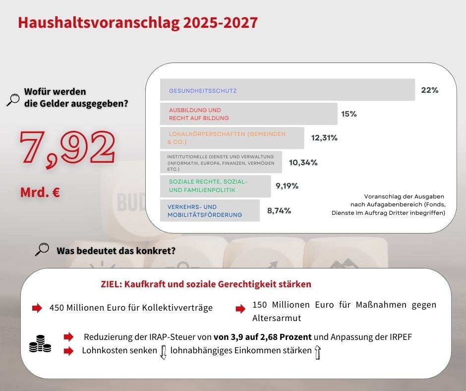 Zudem wird die IRPEF umgestaltet, um die Steuerlast für hohe Einkommen zu erhöhen und die entstehenden zusätzlichen Einnahmen gezielt an Familien mit Kindern weiterzugeben. Der Haushaltsentwurf sei ein konkretes Bekenntnis zu sozialer Gerechtigkeit und nachhaltiger Entwicklung, erklärte Landeshauptmann Arno Kompatscher zum Budgetentwurf.