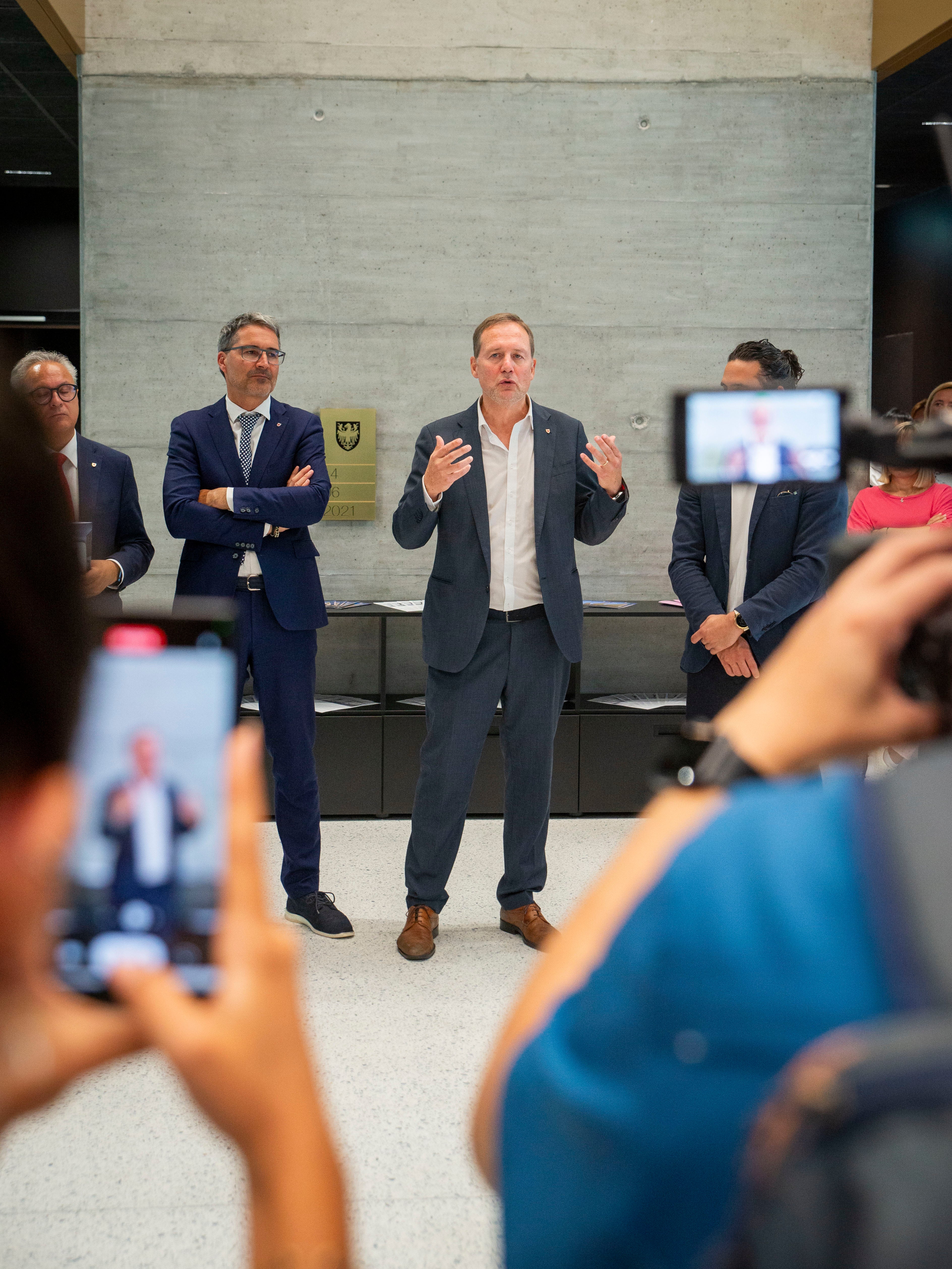 An der Stelle des zuvor abgerissenen "Christanell"-Gebäudes wurde in nur zwei Jahren und mitten in der Pandemie-Zeit ein neues Gebäude mit 150 Arbeitsplätzen für die Landesangestellten errichtet. Das Projekt, das von der Landesabteilung Hochbau und technischer Dienst betreut wurde, soll vor allem dazu beitragen, öffentliche Gelder einzusparen und den Mitarbeitenden des Landes passende Arbeitsräume bieten.